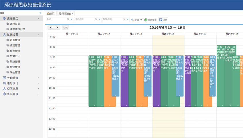 - 課程日歷: 自動(dòng)排課、課程調(diào)整、多維度課程查詢